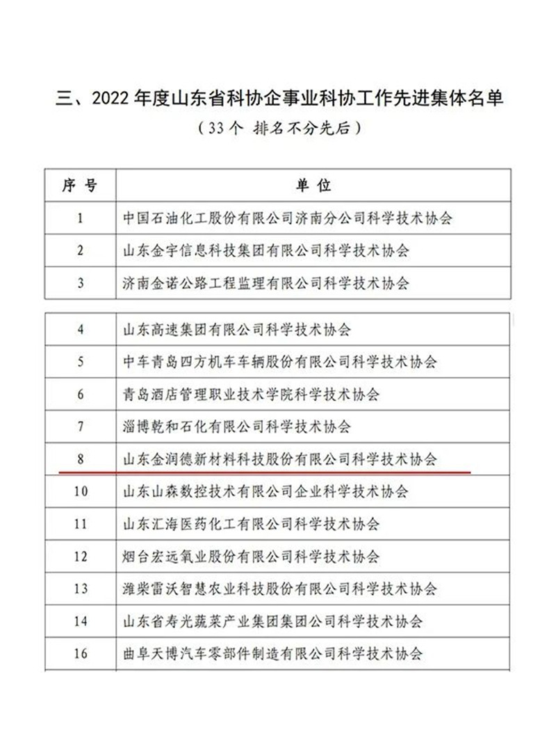 2月10日,山东省科学技术协会印发《关于2022年度山东省科协学会工作和企事业科协工作情况的通报》,金润德科协荣获“2022 年度山东省科协企事业科协工作先进集体”称号,李家泉董事长荣获“2022 年度山东省科协企事业科协优秀工作者”称号。